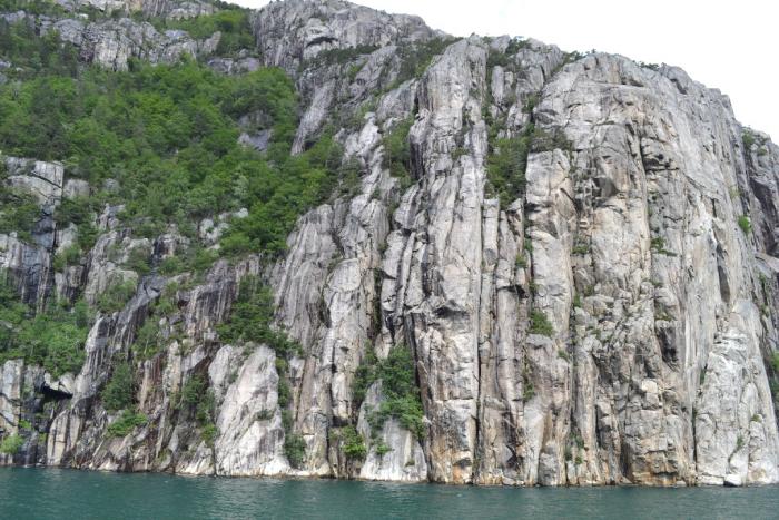 Поэтому первым делом поехали к паромной переправе в Лауввик, от которой паромы ходили как и по Люсефьорду, так и дороге на Прекестолен, чтобы уже в рабочем порядке перестраивать программу на день. Нам повезло, паром по Люсефьорду был автомобильным и очень скоро от нашего приезда к паромной переправе (в районе 11 часов). Заехав на паром и заплатив порядка 3000 рублей, отчалили на нашу последнюю водную экскурсию по фьордам. Люсефьорд оказался достаточно интересным природным явлением – его берега очень часто были, как говорят в путеводителях, словно вырублены топором, т.е. очень отвесные и скалистые.