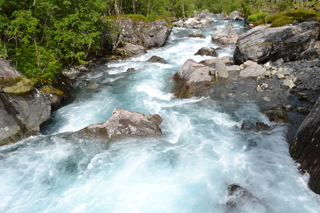 После ужина погода улучшилась, что в 21:30 позволило нам совершить третье мероприятие – поездку на ближайший язык ледника. Сразу от Лоена, от отеля дорога вдоль речки шла в необходимое нам направление. Очень узкая живописная дорога сначала шла мимо нереально красивого горного озера Лоенватнет (для нас в этой поездке – самого красивого), а затем уже непосредственно к языку ледника через Кьенндаль. По пути к нему необходимо было заплатить 40 крон (положить монетки в конверт, написать гос. номер и марку авто, по крайней мере я именно это написал и кинуть в ящик).