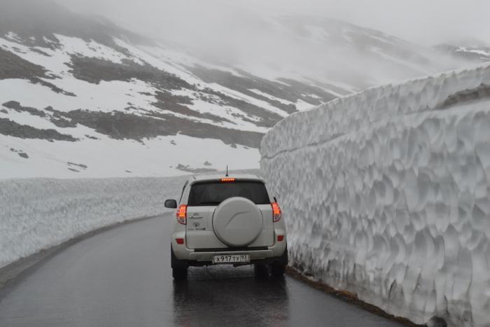 Проснувшись, плотно позавтракав начинающих поднаедать омлетом, натуральным йогуртом и прочим стандартным набором, в 9:30 выехали в сторону старой стрюнской дороги. Погода сильно не жаловала. Дорога узкая, довольно крутая, практически сразу начинается снег, часто доходит до 1 метра в высоту, но местами до 4-х метров!