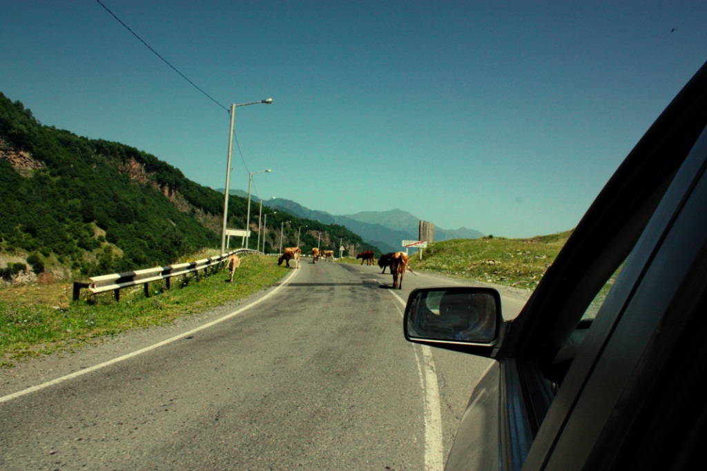 Всех нас буквально завораживал вид коров, пасущихся на мостах и в тоннелях. Возможно, этот природный кондиционер оказался более заманчив для рогатых, чем зеленая травка на лугах и склонах, которыми изобилует Грузия. Но, я не припомню ни одного моста, где бы ни стояло стадо коров, преграждая движения автотранспорта. Если где-то и не было коров на мосту, то были явные следы, свидетельствующие о недавнем пребывании их там. Равномерный слой помета скрывал разметку дороги, и даже Грузинской дорожной полиции приходилось, порой, останавливаться, чтобы уговорить местных хвостатых обитателей отойти хоть немного в сторону, освобождая проезд для транспорта.