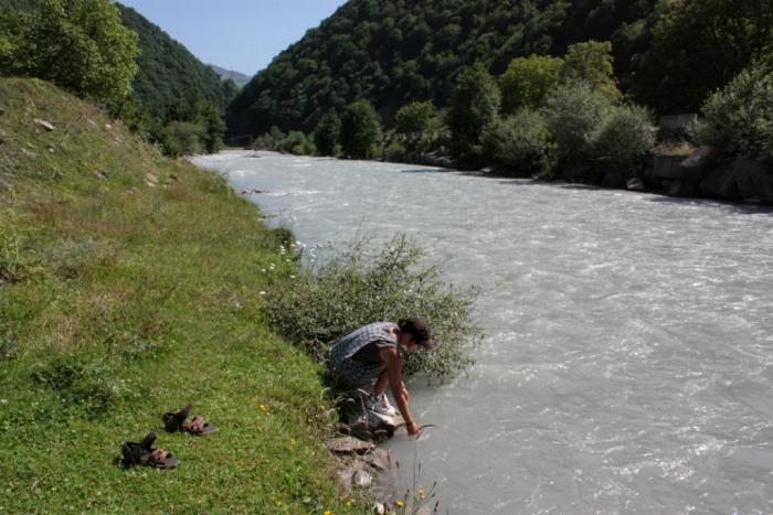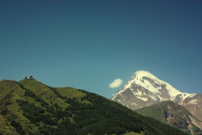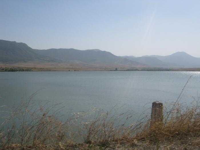 Из Степанцминда (бывший Казбеги), справа по борту, вверху, увидели вечнобелую вершину горы Казбек. Церковь Святой Троицы в Гаргети. Дух захватывает. Сразу за поселком начинается дорога из гравия, и тянется примерно до Крестового перевала, километров 30. Ехал по ней 40-50 км. в час. Окна открыты, пыль столбом. Панель приборов покрылась равномерным, серым слоем пыли. Внешний вид машины, еще вчера сверкающей чистотой- просто не узнать. После Гудаури началась отличная дорога и больше не заканчивалась уже до Тбилиси. Спускаемся вниз, вдоль Куры. Потихоньку подкрадывается усталость, накопившаяся за 2 дня пути. Проезжаем слева водохранилище. Останавливаемся для того, чтобы размять ноги, делаем пару фоток на память.