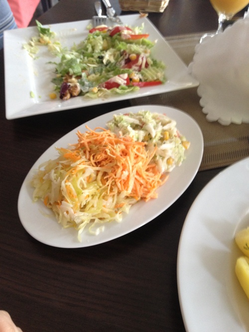 Мы были единственными посетителями. Заказал ФЛЯКИ, салат с курицей гриль на пополам с дочей, а ей куриную отбивную в панировке с земняками и додатками, а также себе кофе, а дочери воду.