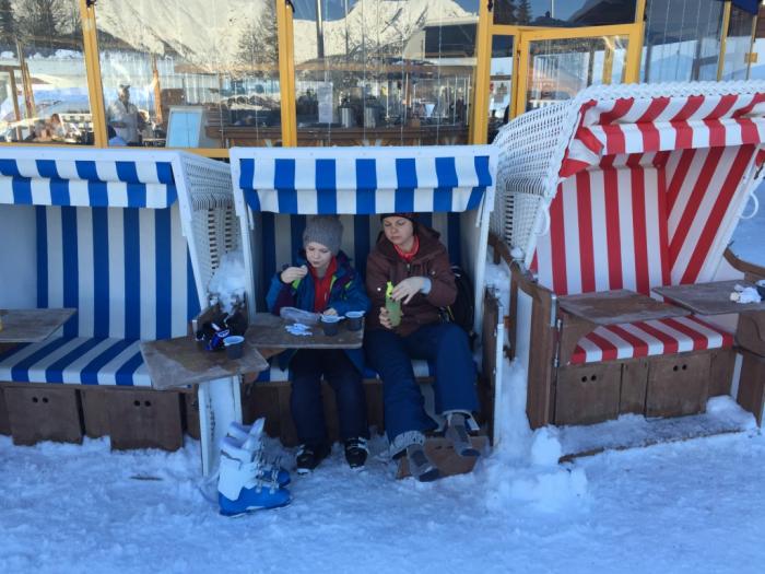 3) Бугельные подъемники типа «тарелка» на зеленых трассах очень мягкие, наш ребенок освоил их на второй день катания. Кресельные подъемники на синих трассах практически останавливаются на финише, так что съезжать с них очень просто.