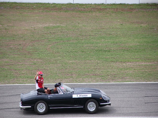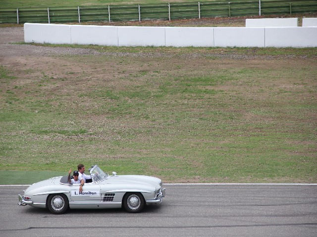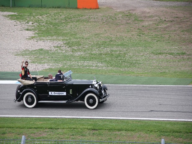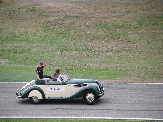 После того как все гонки (кроме Ф1) закончились, начался парад пилотов на ретро автомобилях. Сначала они проехали круг без пилотов, каждая была подписана, а потом на стартовой прямой в них сели «водилы» Ф1.