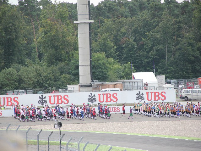 До начала гонки, оставалось около часа, и чтобы зрители не скучали, начался еще один парад. Парад гильдий и сословий (ну мы так поняли). Выходит колонна представителей местной власти, в средневековых национальных костюмах, со старинными флагами городов и самой «земли» (области) Баден-Вюртемберг.