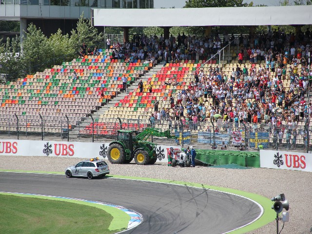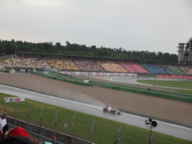 Тренировочные и квалификационные заезды шли один за одним. Наконец то пришла очередь Ф1. Она прошла с единственно интересным моментом, прямо перед нашими трибунами. Это как Льюиса на торможении в левый поворот не вошел и влепился в отбойник. Он достаточно быстро из машины эвакуировался и ходил вокруг мешая стюардам. В барьер безопасности он вошел практически плашмя и здорово его сдвинул. Так что работникам автодрома пришлось потрудится, чтоб все восстановить.