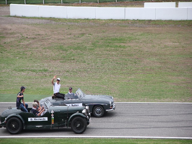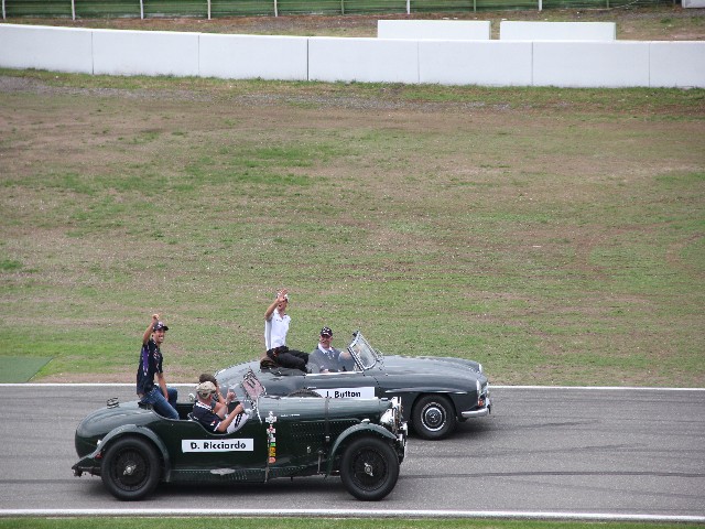 Сначала они проехали круг без пилотов, каждая была подписанна, а потом на стартовой прямой в них сели «водилы» Ф1 и они уже с ними сделали еще круг приветствую болельщиков.