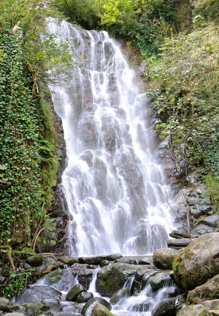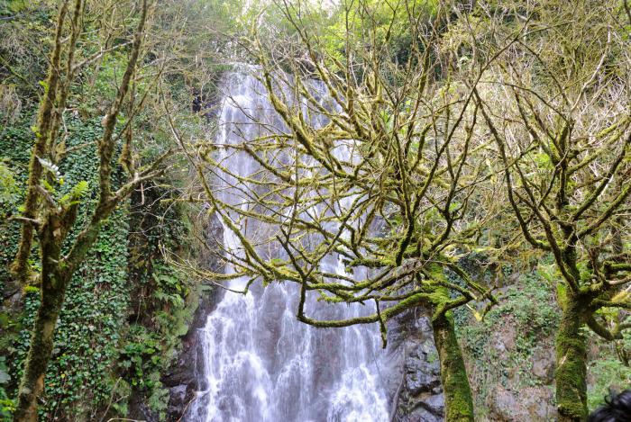 Водопад красивый. Тропка к нему едет среди мохнатых деревьев и потом очень милая площадка для отдыха возле падающей воды. Он не шибко высокий, но это ведь и не главное. Приятно, что тут нет присущей для мало-мальски достопримечательных мест туристической инфраструктуры. Палатки, кафешки, зазывалы всяческие отсутствуют.