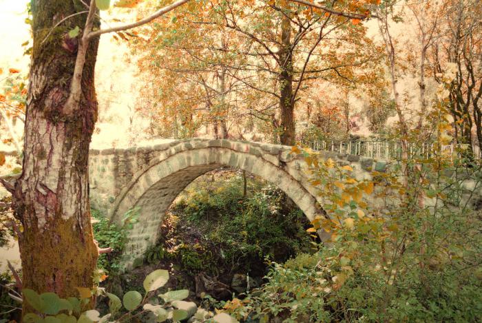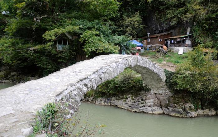 Тут же рядом через речку переброшен еще один каменный мостик Тамары. Предполагается, что строить их начали по её указанию. Этих арочных мостов в Аджарии сохранилось больше двадцати. Скальные камни, соединенные известковым раствором. Им почти 900 лет и хоть бы хны. И это не бутафория, они вполне себе использовались (стали бы ребята просто так напрягаться в то время ради красивых декораций). Хотя есть вариант, что всё-таки реставрируют. А может и нет.