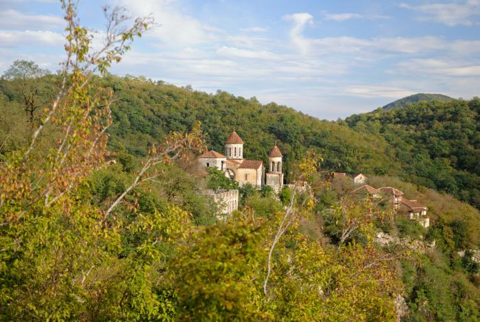 В отличие от гелатского монастыря здесь очень тихо и уютно. И это притом, что наше посещение совпало со свадебной фотосессией. Наверно местные церковные артефакты тут малозначительны по мнению составителей турмаршрутов. Зато у нас есть возможность без людей походить, порадовать взор, воздухом подышать. По всему выходит, что если бы тут монастырь не стоял, то его надо было бы здесь построить, уж очень удачно он вписывается в пейзаж.