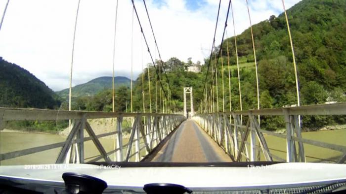 Сперва более близкий Мирвети. Чтобы к нему проехать надо переправиться через речку Чорохи по узенькому мостику. В аккурат для одной машины. Я даже зеркала свернул, а то вдруг рука дрогнет.