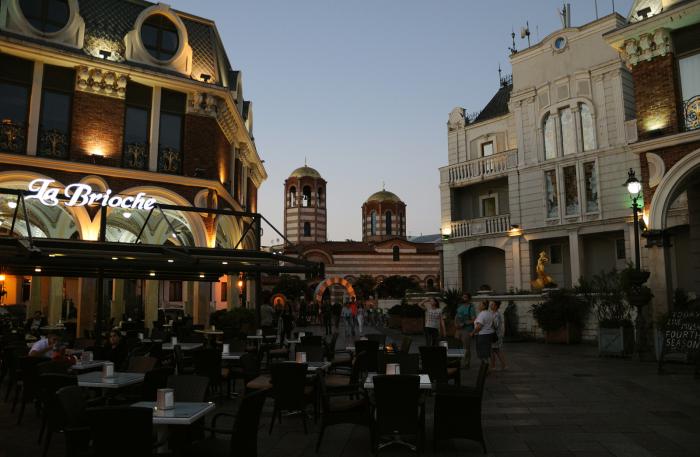 Есть тут еще интересные фонтаны, но до них пешком топать и топать, доехали на машине. А они какие-то так себе. То есть помасштабнее, чем те первые, и вариантов струй тут побольше, находятся посреди водоема, но не смотрятся. Все происходит под музыку. Только это лишь теория. На практике рядом пара ресторанов, нестройное звучание которых совершенно перекрывает фонтанную задумку. Рядом высятся несколько современных зданий с подсветкой, видимо призванных придать городу черты современного мегаполиса. Сомнительно.