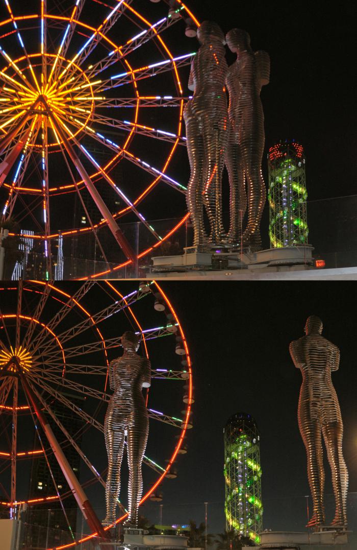 Оказалось, что променад вдоль моря весьма утомителен и потому для нас он был стремительным и малоинформативным. Под напев муллы с ближайшей мечети (вот уж чего не ожидал услышать в Грузии) прошли на площадь Пьяцца и оттуда к скульптуре «Али и Нино». Действительно трогательно и символично, там же целая легенда на три листа, предполагающая под собой реальную историю. Прямо под композицией лирично импровизирует гитарист. И всё это задорно перекрывает зараза-глашатай, неутомимо зазывающий народ в незабываемое плавание вдоль берега на «Красавчике». Фигуры влюбленных благополучно сошлись, разошлись и мы отправились дальше.
