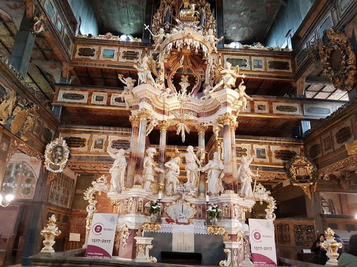 Его еще называют в разных источниках Церковь Мира или Костел Покою. Даже начитавшись предварительно источников из сети и посмотрев фотографии, мы все же не ожидали, что деревянная церквушка окажется такой огромной и такой изысканной внутри. И такой холодной, хотя об этом тоже писали…