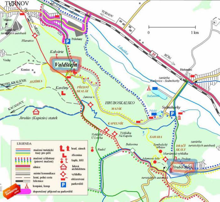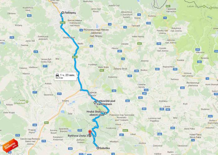 Из Либерца по указаниям какого-то доброжелателя из сети, поехали на юг по автодороге Е442(35) в направлении на Прагу, Градец Кралове (Praha, Hradec Kralové'), в пригороде Турнова выбрали направление на Гаррахов, Турнов и Йичин (Harrachov, Turnov, Jičin). Проехав через Турнов повернули направо на боковую дорогу на Пелешаны (Pelešany), и далее по указателям «на замок Вальштейн» или «Autocamp Sedmihorky», возле которого паркуемся – дальше до самого замка автодороги нет, только пешком. Как выяснилось потом, можно было добираться другим путем, автодорога к замку все же есть с другой стороны.
