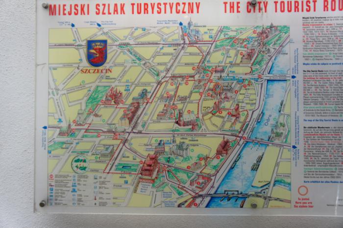 Во время прогулки по Щецину на тротуарах города можно увидеть красную пунктирную линию, значение которой не каждому удается разгадать. Однако ответ лежит на поверхности: эта линия обозначает направление к наиболее интересным достопримечательностям Щецина. Маршрут, который обозначает красная линия, приводит к 42 наиболее интересным достопримечательностям. У туристов есть возможность ознакомиться с планом этого маршрута, который был издан специально для них, на трех языках – польском, английском, немецком.