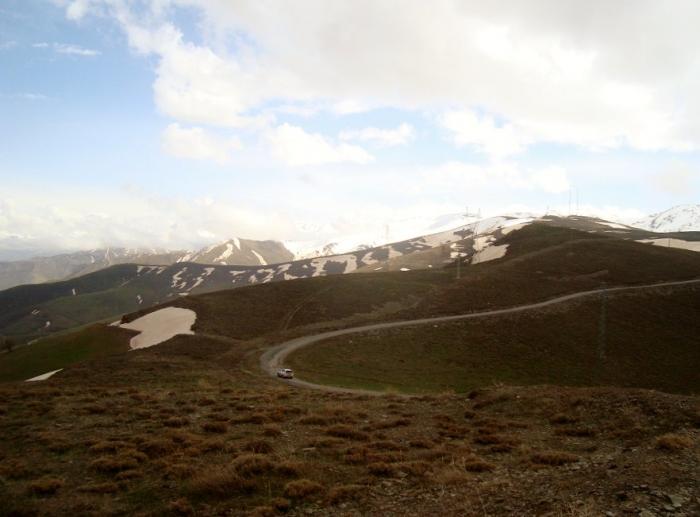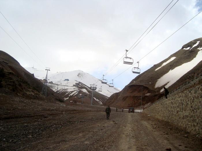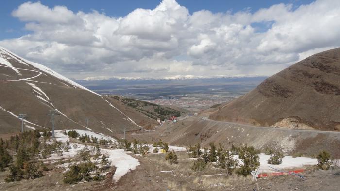 Решив, что колеса наших автомобилей уже достаточно поколесили по хорошим асфальтированным шоссе, из города отправились прямо на юг, по едва обозначенной на карте колее мимо горнолыжного курорта Паландокен через хребет с таким же названием. Дорога закончилась у смотровой площадки отеля, откуда открылся великолепный вид на долину и город Эрзурум. Выше – только опорные столбы подвесных канатных дорог.