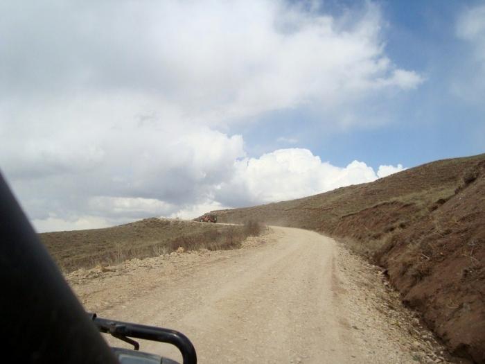 Чуть ниже цитадели переезжаем по мосту речку и по пыльной колее едем прямо на юг в сторону синеющей на горизонте горной гряды. Дорога – хорошо укатанный щебень, то взмывает под облака, то опускается в узкое ущелье.