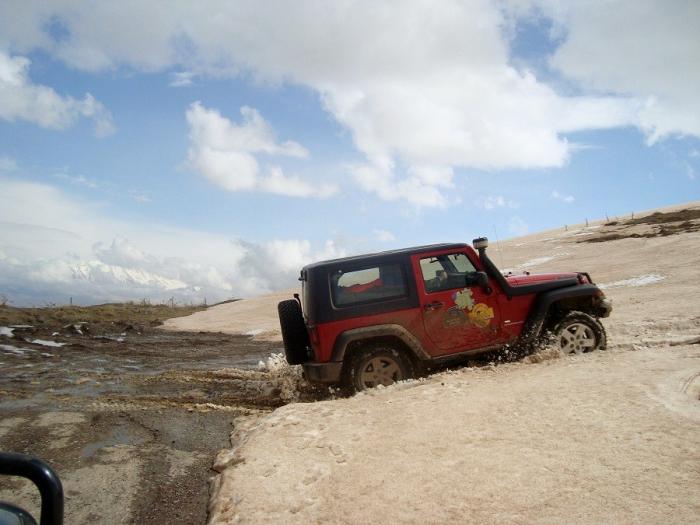 Под ними и проходит нужная нам колея. Оставив позади горнолыжную цивилизацию, через полчаса подъёма по широкому плечу отрога, уперлись в снежные переметы. И если первые два можно было ещё проскочить, то чуть дальше весь склон вместе с дорогой был засыпан мокрым крупнозернистым снегом. Ну, что ж поищем «плохие турецкие дороги» в другом месте.