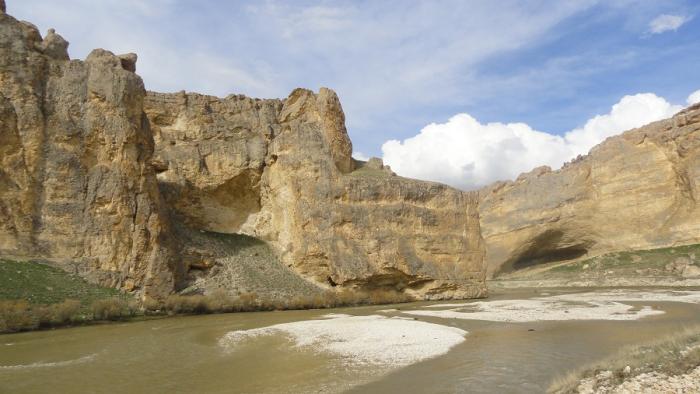 Почти сразу за деревней останавливаемся в восхищении — река и дорога петляют по красивейшему, сложенному из мягких, желтых скал каньону.