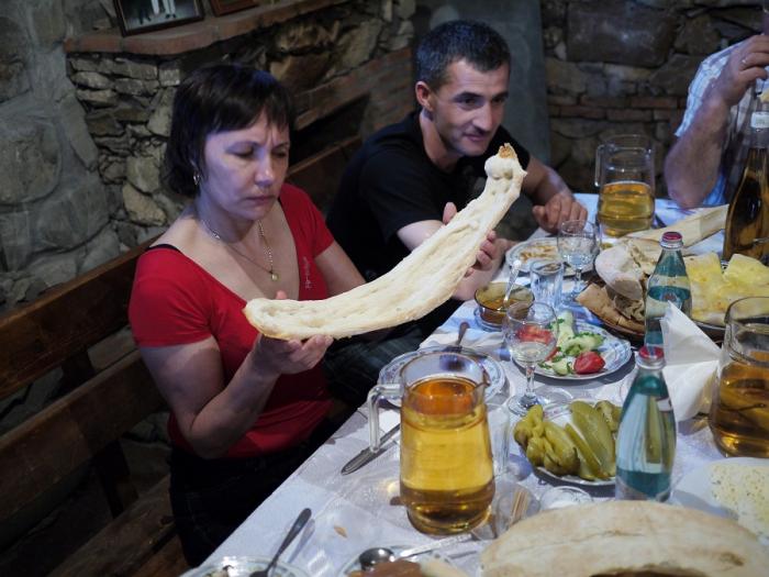 Хинкали и шашлыки, хачапури и горячие лепешки, козий сыр гуда и шляпки шампиньонов с маслом, запеченные на толстостенной сковородке кеци, чаканули – баранина в бульоне с добавлением светлого вина… и всего и не перечислить! Под неторопливую беседу и грузинские тосты трапеза длилась несколько часов. Грузия и грузины мы вас любим!