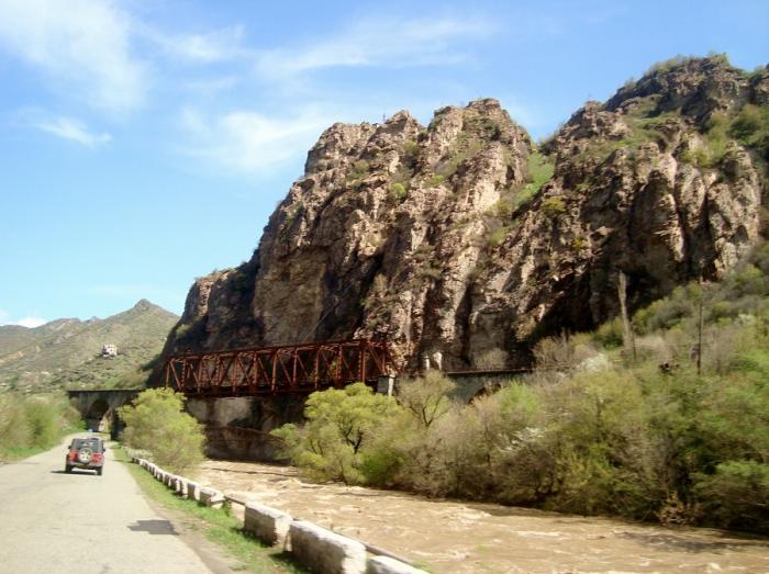 От Дилижана по коленообразному ущелью поворачиваем резко влево и вдоль железной дороги едем по направлению к городу Ванадзор, от которого дорога уходит к грузинской границе. Слева грандиозно высятся вершины Тезлер (3101 м) и Ванадзор (3081 м), справа блестит на солнце снежной шапкой гора Бовакар (3016 м).