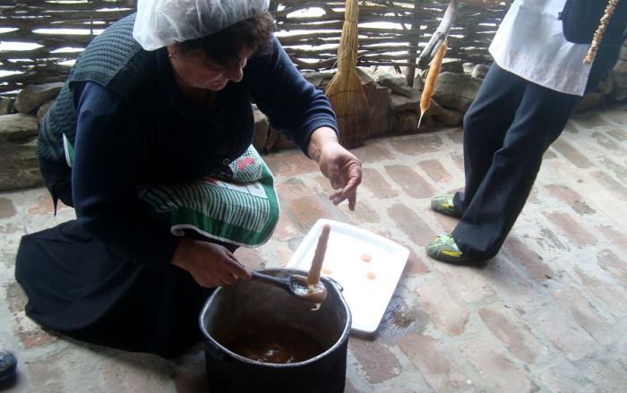 Далее нас знакомят с производством чучхелы – грузинского лакомства, изготавливаемого из орехов, нанизанных на нить и облитых вываренным виноградным соком с добавлением кукурузной муки.