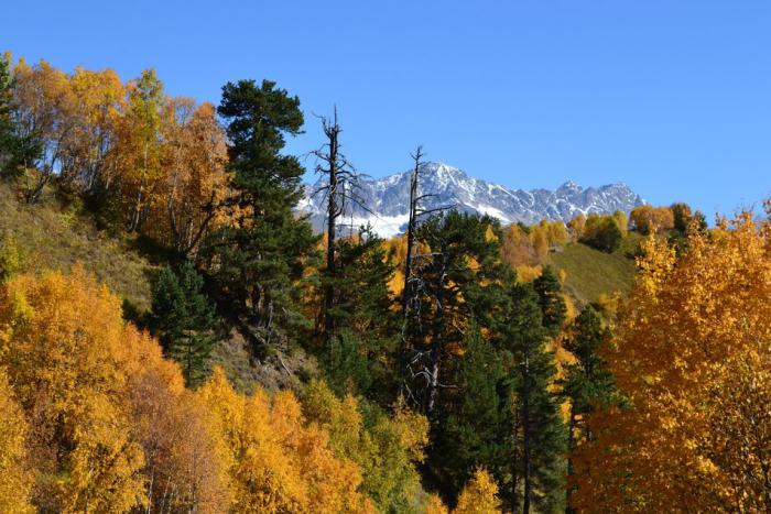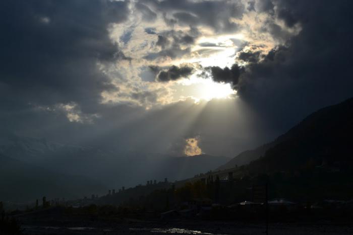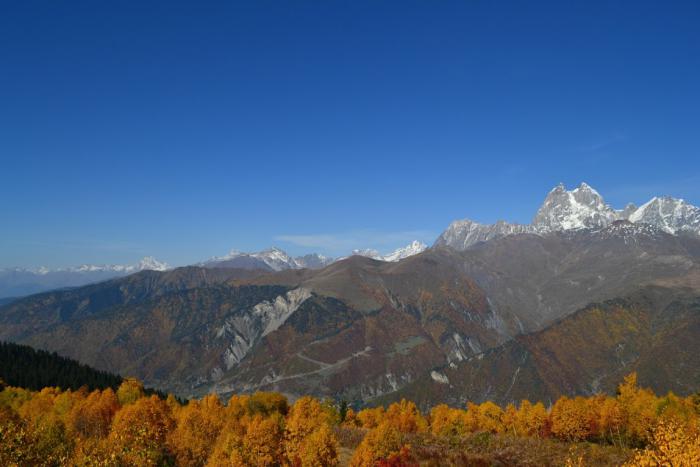 В октябре в Сванетии межсезонье. Погода переменчива, стабильное тепло уже кончилось, а снег в горах для горнолыжного отдыха еще не лег, но обязательно будут погожие деньки вперемешку с холодными дождями. Зато в первой половине октября в горах потрясающее пиршество для глаз. Снежные горы на фоне золотой осени. Здесь описывать нечего, просто смотреть, смотреть и наслаждаться.