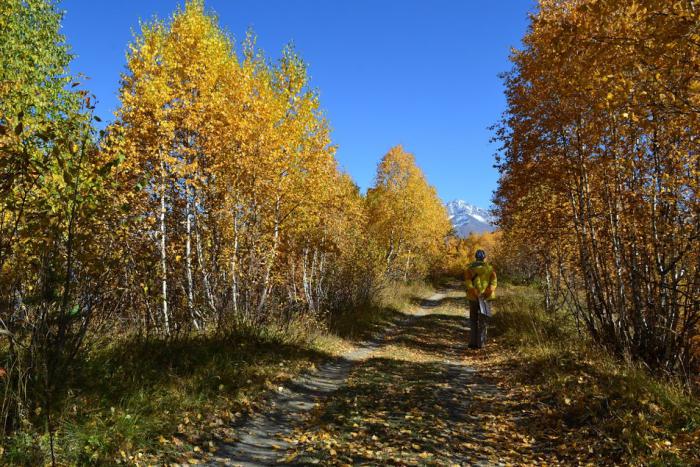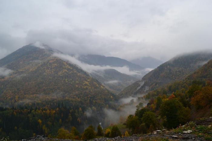 Строить гестхаусы и отрывать кафе сваны додумались, а вот проложить треки и оборудовать смотровые площадки пока нет. Пройдя часть пути по дороге, мы поняли, что кроме великолепия осеннего леса мы ничего не видим, а ведь буквально за теми березками сияет двурогой короной Ушба.