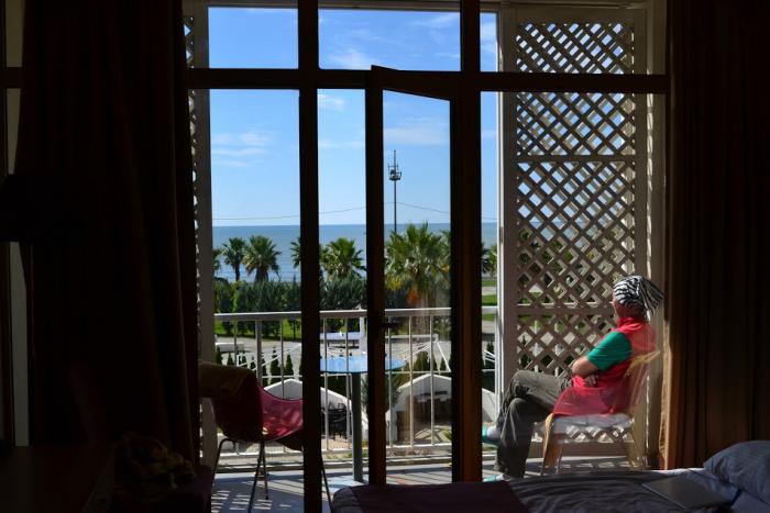 В отличие от Сванетии вряд ли мы специально еще раз заглянем в АнАклиа. Не хочется перебивать настроение приятной ленности и неги от удовольствия сидеть на балконе и созерцать море, набережную, пальмы, бассейн. А у бассейна никого! Тишина и благорастворение воздухов.
