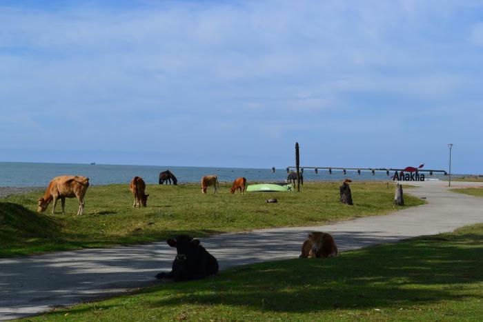 Удивило отсутствие кафе и ресторанов. Уже хотелось, пощадить здоровье и поесть не на территории отеля, но альтернативы не нашлось. Может быть, летом организуются сезонные кафешки, а может быть, отдыхающих в частном секторе кормят хозяйки гестов, или они сами готовят… Ясно одно, в октябре поесть за территорией гостиницы негде. Только малоформатные магазинчики. Даже рынка нет. Местные ездят на рынок в Зугдиди.
