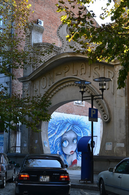 Ну, не будем о грустном. Посмотрите, какая прелестница выглядывает из арки в Кутаиси. Хоть и не в бронзе отлита, зато, сколько шарма и обаяния.