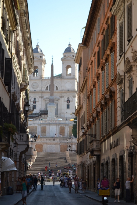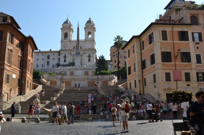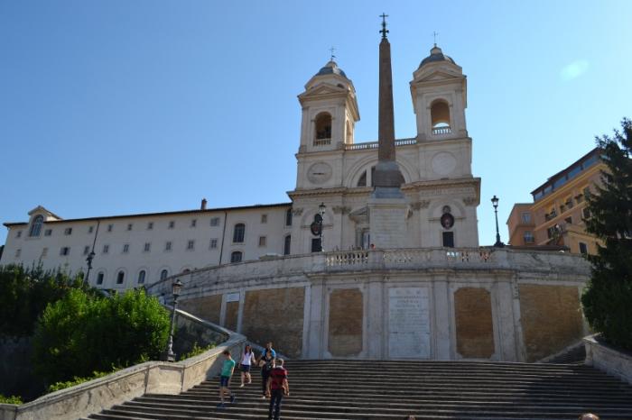 От стоянки мы пешочком минут за 10 мы подошли к началу маршрута — площади Испании и знаменитой Испанской лестнице с французкой церковью Тринита-де-Монти. Про эту лестницу написано очень много, здесь сняли не один фильм и придумали не одну легенду, и считается, что это самая известная и красивая лестница Европы. Здесь суета круглые сутки. Но утром все же народу чуть меньше, поэтому можно даже сделать фото, что среди дня гораздо сложнее.
