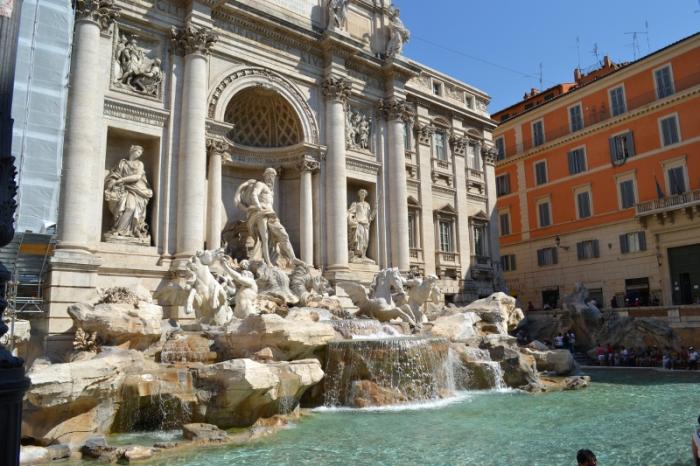 Если перейти на сторону универмага, пройти дальше и свернуть налево на Via delle Muratte, то попадаешь к знаменитейшему фонтану Треви. Народу, конечно тьма. Все стараются закинуть монетки. Мы что-то пока фотографировались, так и не бросили монетки. В свою декабрьскую поездку я уж постаралась ликвидировать этот пробел и забросила целую горсть. Чтобы с гарантией.