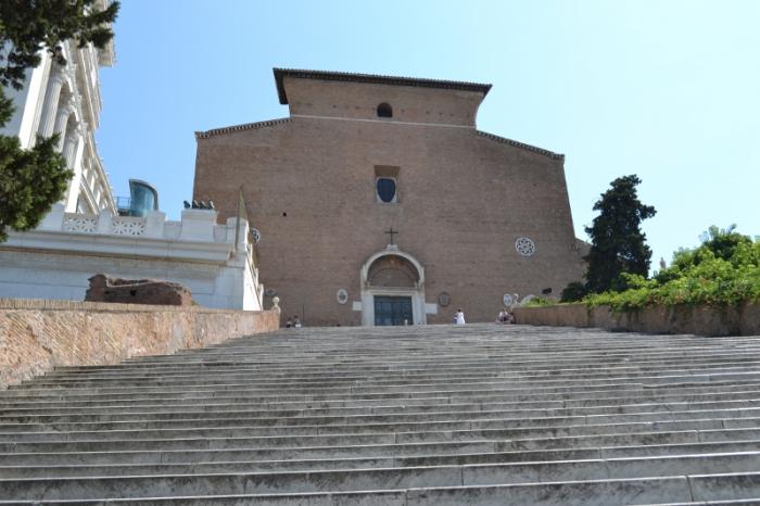 Обойдя Алтарь справа, попадаешь к церкви Санта-Мария-ин Арачели (Santa Maria in Araceli). Невзрачная снаружи, она кажется очень небольшой. Поднимаешься к ней по 122 ступенькам.