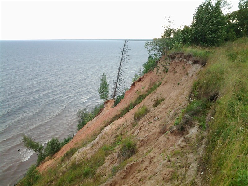 Теперь про Андомскую гору. Находится она посередине между мысом Андомским и устьем реки Андома. Представляет из себя высокий, крутой, обрывистый берег Онеги. Вид с берега открывается бесподобный — почти 180° водной глади + 30° лесных просторов в глубину более 10 км за рекой Андома. Кто бывал в горах, того не удивить, но для нашей равнинной местности увидеть такой простор это редкость. Что-то подобное наблюдал на родине С. Есенина в д. Константиново — вид с крутого берега на и за Оку.