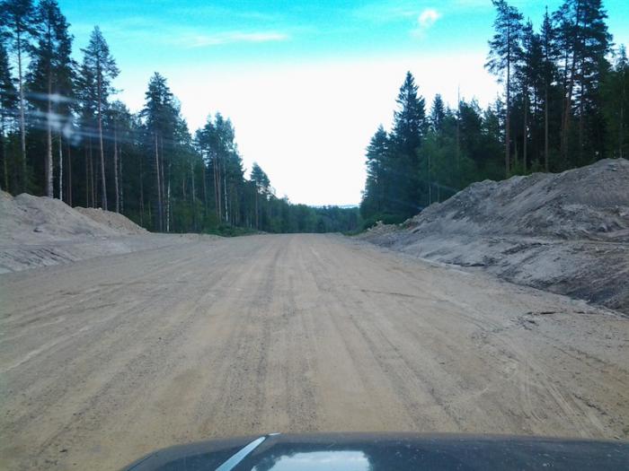 С Великой Губы по новому грейдеру в сторону о. Кижи. Новый грейдер производит двоякое впечатление. Поражает шириной вырубленной просеки, профиль дороги позволит разместить четыре полосы движения или две полосы с двумя 3х-метровыми обочинами. Впечатляют трудности и затраты понесенные при строительстве 30ти километровой дороги, порой с выемками в скальном монолите. В наличии населенных пунктов поблизости нет. Так ради чего? Чтобы возросло количество проданных билетов в музей на Кижах? Так для этого надо еще построить мостовой переход на о.Кижи протяженностью около полутора км. Понесенные затраты не окупятся в обозримом будущем. Получается это проект «Нью Васюки» петрозаводских временщиков. Целесообразнее было бы подправить старую дорогу, благоустроить Великую губу и соединить ее с Мед.Горой твердым покрытием.