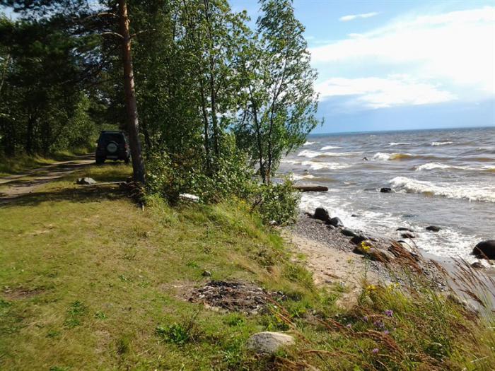 Останавливаюсь в 2х-3х местах, где можно подъехать к Онеге. Полное впечатление, что находишься на море, вода уходит за горизонт, сильный шум прибоя. Берег в основном песок, галька, разбросаны крупные валуны. Сосны вплотную к воде. Далее дорога продолжительно идет вдоль берега. От воды отделена неширокой лесополосой, полно мест для стоянок с машиной, изредка стоят палатки.