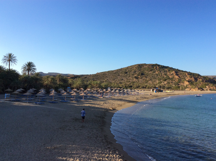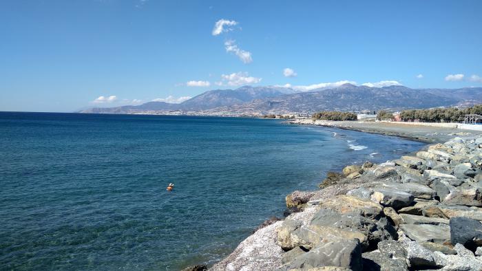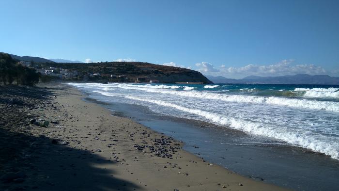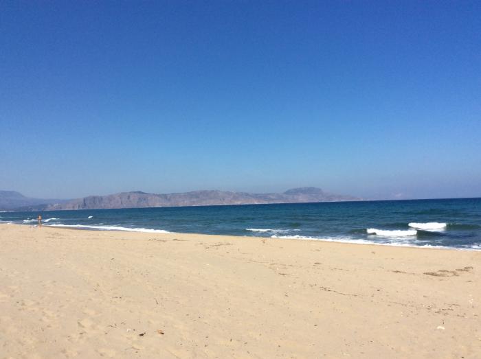 Итак, утро 5 октября в аэропорту Ираклион встретило нас ласковым солнышком, особо приятным после московской осенней мряки. Прокатная контора оказалась всего в 100 м от выхода из аэропорта, где нас уже ждала вышеупомянутая малышка Ипсилон. Прослушав краткую инструкцию менеджера на чистом русском языке, как с этой малышкой управляться, мы погрузили чемоданы и двинулись в путь на запад острова, на всякий случай подключив навигатор, хотя по сути в нем особой нужды не было, поскольку туда вела всего одна федеральная трасса. На выданной нам карте эта самая трасса выглядела куда более солидно, чем на самом деле. Опыт предыдущих автопутешествий по южным заграничным курортам ( мы несколько раз бывали на Тенерифе и Гран-Канарии, где знак 120 — нормальное явление) подсказывал, что вот-вот должен начаться 4-х полосный автобан до самой конечной точки маршрута, но, появившись внезапно, он буквально через пару десятков км так же внезапно и кончился. И мы неторопливо, прижавшись к правой разметке продолжили свой путь. Дорога поначалу проходила плавно по горам-холмам, но вот наконец, километров в 20 за Ретимно, показалось море, и вскоре взору открылся великолепный пляж длиною несколько километров буквально в 20 м от дороги.