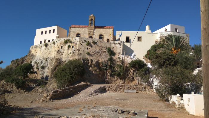 Обратную дорогу выбрали другим путем, более сложным, но зато с великолепными видами — вдоль побережья.Сначала на пути, чуть в стороне (1 км) от дороги попался монастырь с очень сложным названием Chryssaskalitissa, напоминающий средневековую крепость