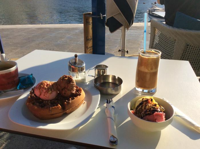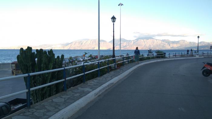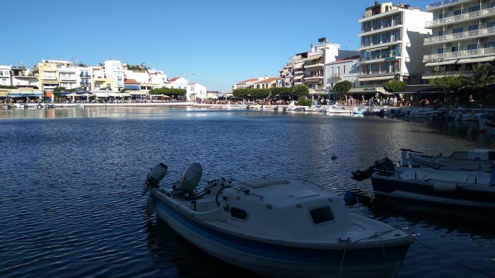 Повалявшись до обеда на местном пляже Элунды и, окончательно убедившись в том, что тюлений отдых не наш вариант, мы сели в машину и поехали в близлежащий город Агиас Николаус, так сказать, на людей поглазеть и себя показать. Городок нам этот ооочень понравился -красивый, чистенький, с чудесным соленым озером в центре. Парковка в самом центре за 3 евро на целый день. А какие там венские вафли с мороженным в кафе на набережной!!!