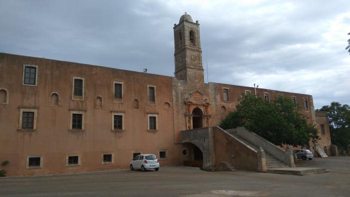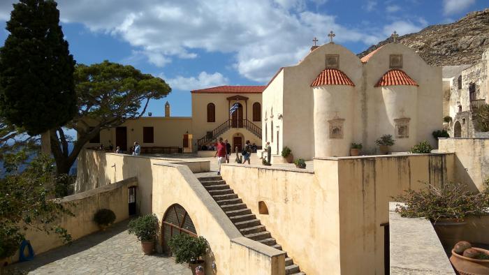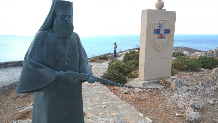 Сегодня мы едем в монастырь Привели, что на южном берегу острова. Впереди 120 км пути, сначала на восток почти до самого Ретимно, затем направо на юг по горной дороге к побережью Ливийского моря. Монастырь известен своим чудотворным крестом, помогающим при глазных болезнях, а также монументом в честь священников, боровшихся с немецкой оккупацией 1941-45 годах. Монумент очень необычный, по крайней мере мне раньше не доводилось видеть служителей церкви с автоматом.