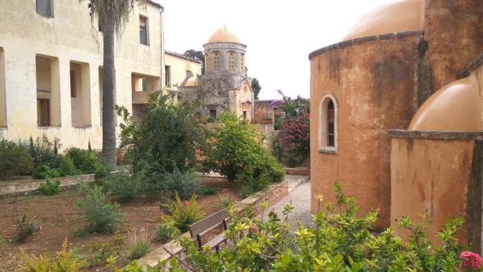 И вот всего в паре километров цель — монастырь Агиас Триадас. Достаточно известный на весь остров, полно про него информации в инете, поэтому не буду подробничать, скажу лишь, что из десятка других монастырей, которые удалось нам увидеть на острове, он оказался самым солидным что-ли: высокие стены, просторный внутренний двор и конечно же дегустационный зал, где вам БЕСПЛАТНО предложат отведать всю продукцию, производимую в нем: вина, мед, варенье и конечно же оливковое масло. Всего этого напробовавшись и, как следствие, закупившись, двинулись дальше к следующему монастырю, который оказался всего в 7 км рядом.