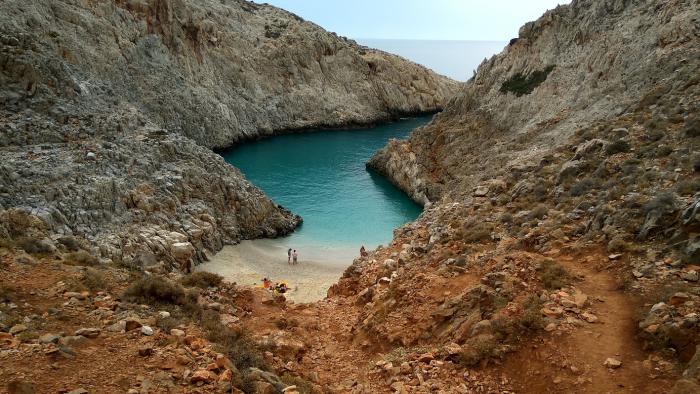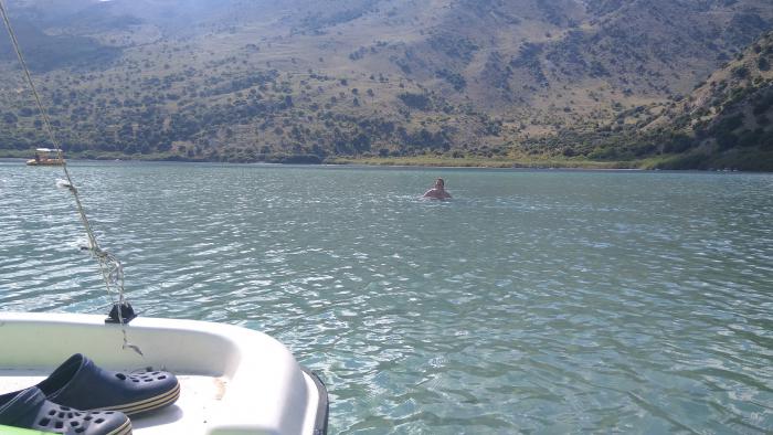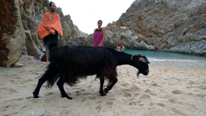 В багажнике валялись только сланцы, а возвращаться домой за кроссовками не хотелось, поэтому, переобувшись в сланцы, мы стали спускаться. Пройдя половину пути, поняли, что вляпались в авантюру, поскольку тропа местами представляла собой практически отвесный спуск и требовала не только правильной обуви, но и изрядной физической и горно-восходительной подготовки. Но отступать не хотелось и мы продолжили спуск. Зато какой кайф было ощутить под собой в финале ровную песчаную поверхность небольшого пляжа!!! Да еще видеть вокруг себя такую красоту. Нам повезло, народу было мало, кроме нас небольшая компания итальянской молодежи, молодая пара из Белоруссии, да пара горных козлов, спустившихся в поисках чего-нить вкусненького от туристов. Очень необычные ощущения плавать среди отвесных высоких скал при полном штиле, как в каком-то гигантском бассейне. Пожалуй, это место произвело самое сильное впечатление и оставило самые сильные эмоции от всего нашего пребывания на Крите.