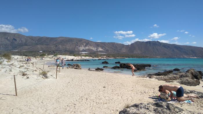 И вот, спустя еще минут 40 езды, мы наконец въезжаем на пыльную парковку Элафониси и начинаем путь к розовой мечте. Ну что ж, мечта сбылась, песок действительно оказался сильно розовым.