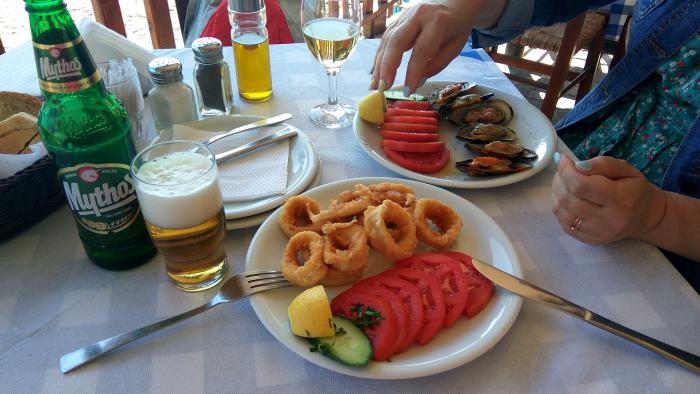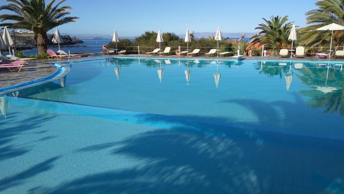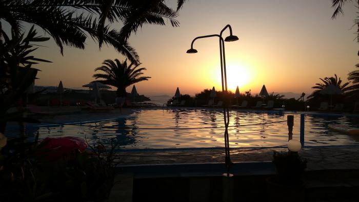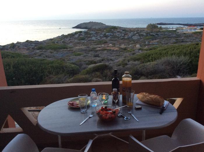 Решение было принято мгновенно: включаем правый поворот и съезжаем с автобана практически на песок на первое свидание с морем. Это очень важный момент каждой поездки, ведь от того как оно пройдет это первое свидание, какое задаст настроение, зависит весь дальнейший ваш отдых. Нам повезло, свидание прошло успешно: ласковый теплый ветерок, кристально чистая вода в неторопливых волнах и теплый, а не обжигающий как летом, белый песок, полностью стряхнули с нас осеннее оцепенение, которое мы привезли с горячо любимой Родины. Реакция организма на столь резкие перемены сказалась мгновенно — захотелось есть. Благо поблизости оказалась таверна — такая же малолюдная, как и весь пляж, где мы впервые вкусили критских вкусняшек. Какого же было наше удивление, когда вместе со счетом нам принесли комплимент, состоявший из запотевшей бутылочки ракии и бисквитного десерта. Помятуя напутственные слова менеджера прокатной конторы:«По грунтовкам и пьяными не ездить!», я перед запотевшей рюмочкой ракии спасовал, как впоследствии выяснилось- совершенно зря, а вот супруга не отказалось, и мы в приподнятом настроении двинулись дальше. Уже через пару дней, пообщавшись с местными, я узнал, что в отличии от нас, свою водку они пьют по окончании приема пищи, так сказать, для процесса ее лучшего усвоения организмом, и пара рюмочек ракии за рулем у них не считается криминалом. И вот, 170 км позади, и мы паркуемся на грунтовой площадке возле отеля. Нас встречает милая хозяйка, ведет в наши апартаменты, где на самом видном месте красуется точно такая же запотевшая бутылочка ракии и куча всяких десертиков -приветственный комплимент от хозяйки. Ответным жестом мы дарим ей 0,35 Путинки и Белевский набор пастилы, чем вызываем неподдельный восторг и индивидуальное внимание с ее стороны до конца нашего пребывания. Апартаменты в действительности оказались такими же как на ярких фотках букингкома: просторная спальня, хорошо экипированная кухня, уютная лоджия с видом на море, где нам предстояло провести 5 безмятежных ужинов под шелест прибоя. И конечно же огромный бассейн с морской водой 3-х метровой глубины.