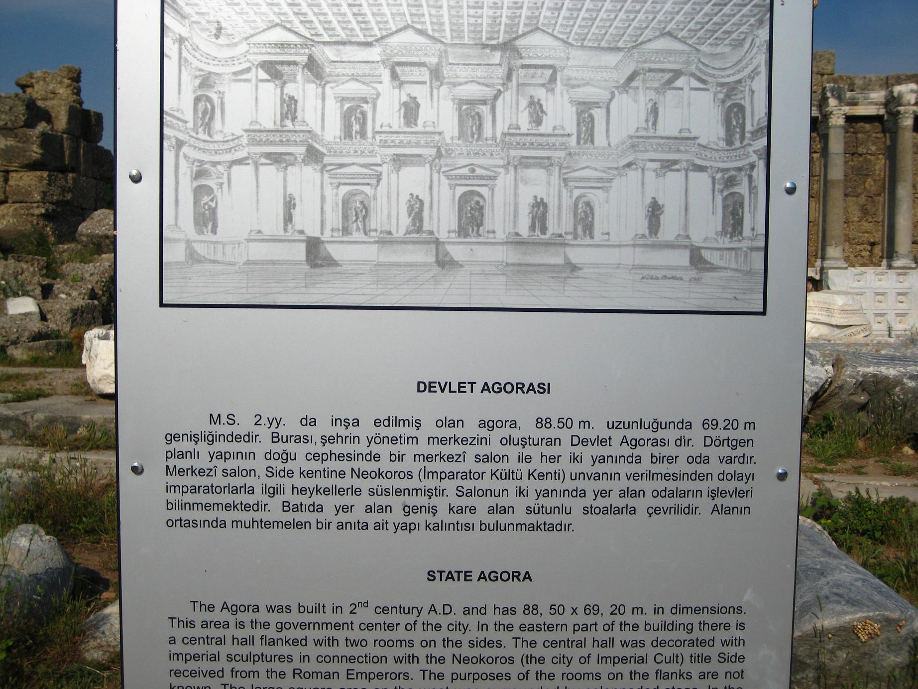 О величайшей красоте Сиде, говорит то, что здесь насчитывалось более чем несколько агор. Сегодня, перед музеем находится агора с портиком, а позади нее выстроен торговый ряд. В центре агоры находится храм богини плодородия. До нашего времени дошло лишь основание храма. Вокруг храма выстроены 12 колонн.