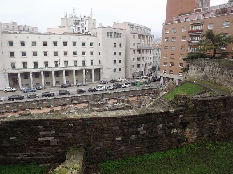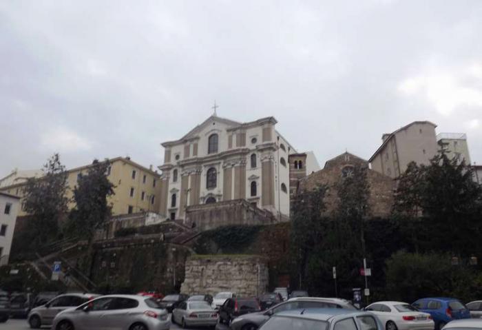 Поднимаюсь на горку, на которой находится главный кафедральный собор города-Cattedrale di San Giusto.По пути наблюдаю сверху развалины романского театра.Датой строительства театра принято считать 1 – 2 века нашей эры. В эту эпоху театр находился на берегу моря. На широких ступеньках, использующих естественный склон холма, могло уместиться до 6 000 зрителей. Сцена театра была украшена статуями и фонтанами.