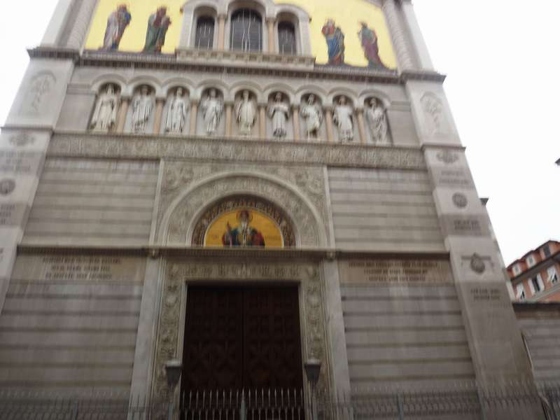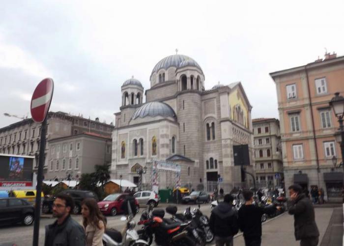 Вышел из трамвая как раз после того как отцепил он вагонетку, а до этого вагоновожатый даже дверь не открыл, думал вот моя машина увезет меня сейчас на конечную а потом опять в гору подниматься.Но после того, как вагонетка была отцеплена, двери к моему счастью наконец-то открылись. Я снова за рулем и снова ищу парковку уже ближе к главной площади города-Площадb единства Италии (Piazza dell’Unita d’Italia).И опять невозможно найти свободное место даже на синих островках-платных парковочных местах.Сегодня воскресенье-Domenica, несмотря на то, что погода не располагает к прогулкам, итальянцы не унывают и массово прогуливаются по широким улицам и проспектам города, к тому же и магазины гостеприимно ждут впредверии Рождества многочисленных клиентов. Пришлось сделать 3 круга прежде чем нашлось местечко причем даже не на платной площадке.До площади Единства рукой подать, а наверху возвышался церковь святого Сильвестра (Chiesa di san Silvestro) – самая старинная церковь во всем Триесте, находится на одноименной площади. По всей вероятности, она была построена в начале XII века. В настоящее время эта церковь принадлежит швейцарской общине Триеста.