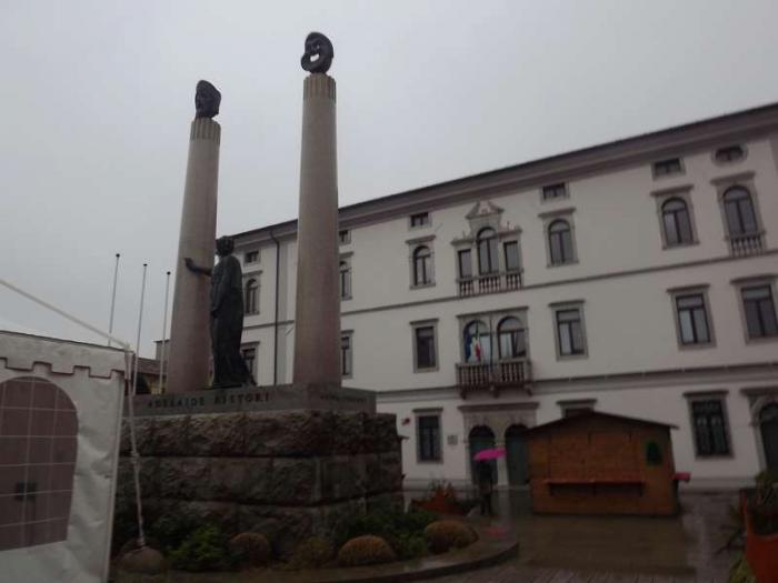 В каждой такой итальянской деревне больше похожем на поселок или маленький городок обязательно есть chiesa(церковь) и памятник падшим во время войн.Приехав в Чивидале Дель Фриули ставлю машину недалеко от кафедрального собора.Еще нет и 9 часов народу совсем мало, основная масса горожан сейчас направляется к Дуомо на службу.Воскресная служба для миллионов итальянцев-дело святое.По пути на площади Piazza Foro Giulio Cesare вот такой монумент